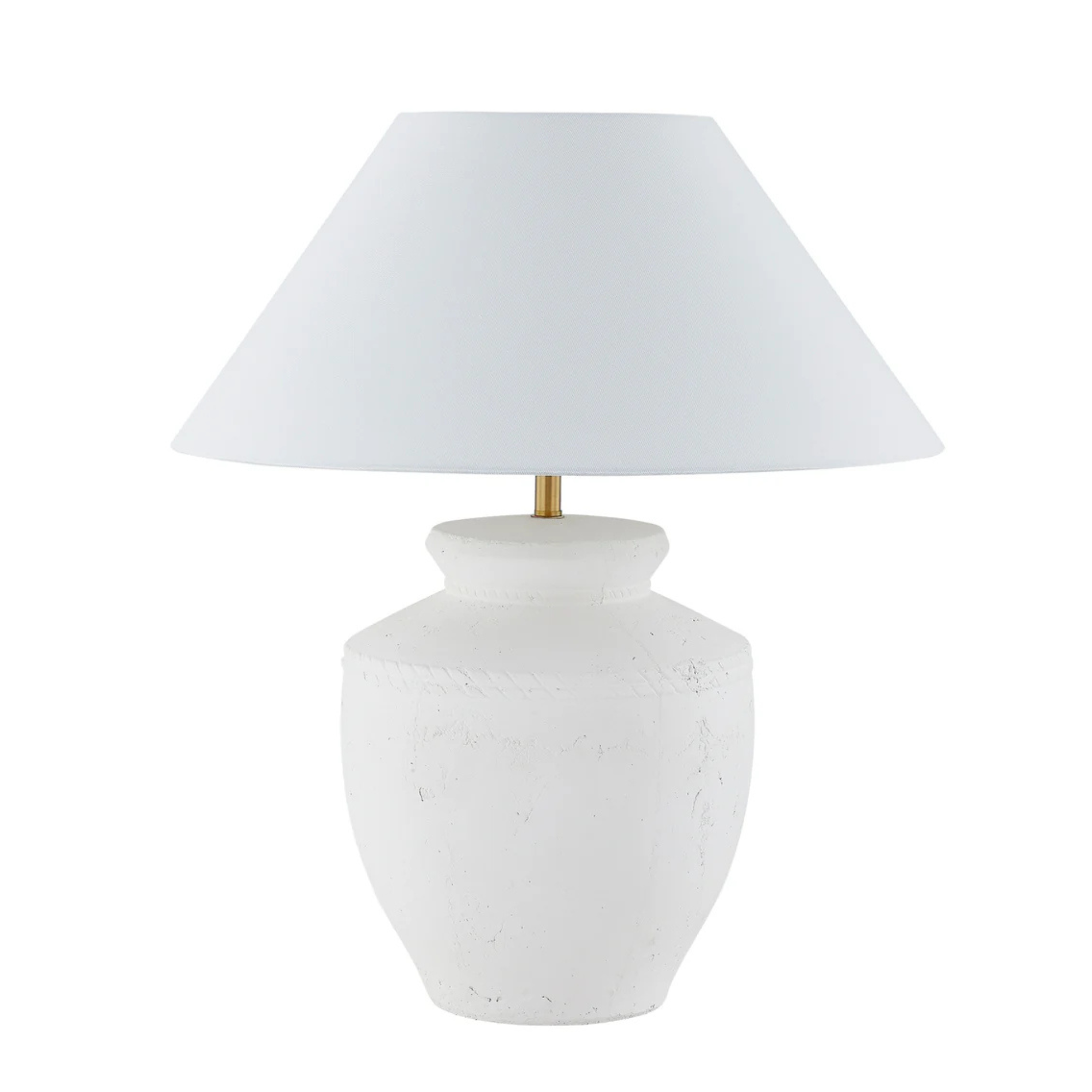 Elevate your space with this beautifully crafted ceramic table lamp, designed to fit any style. Its classic rounded silhouette is finished in a textured white finish, offering a refined yet versatile look. Delicate braided detailing adds subtle dimension, while gold hardware provides a modern contrast for a touch of sophistication. Topped with a crisp white empire shade, this lamp effortlessly balances timeless elegance with contemporary charm, making it a perfect accent for any setting.