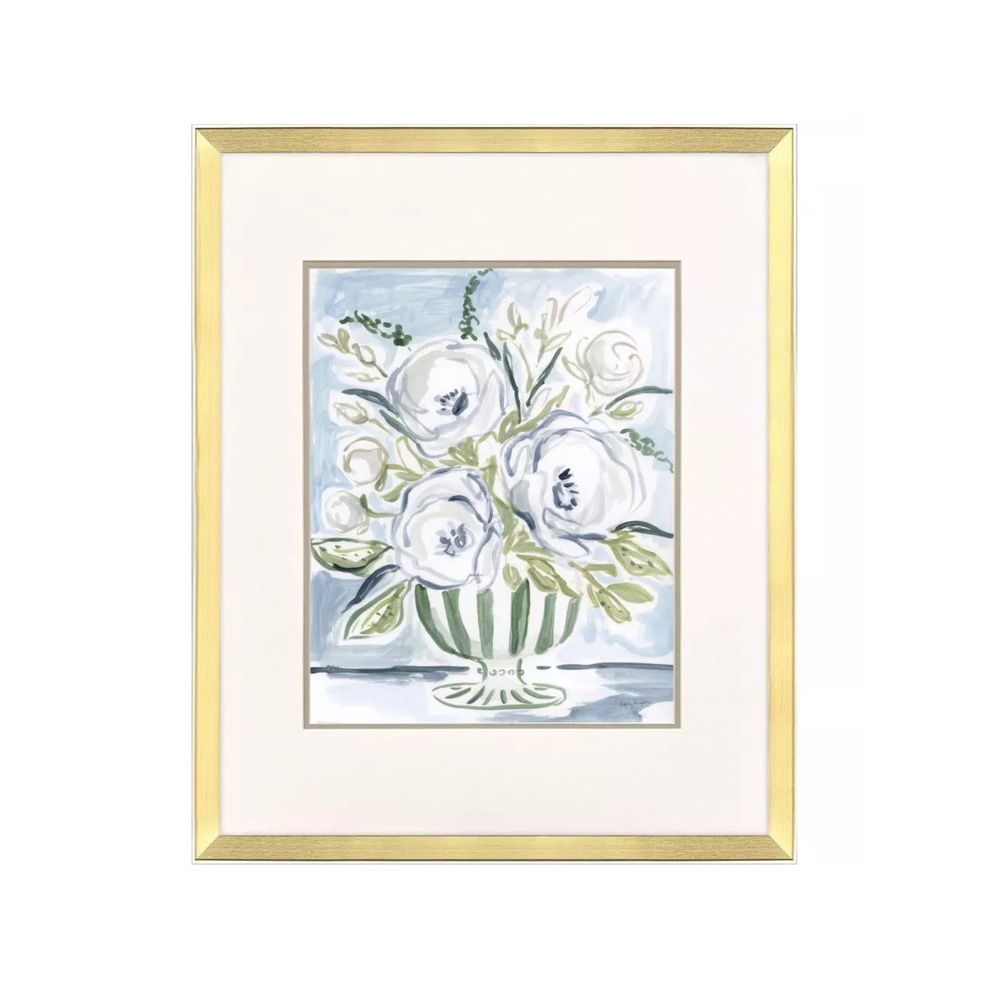 Delicate floral arrangements showcase vibrant botanical subjects rendered in soft, cheerful hues. Each piece arrives matted in crisp white and presented in elegant gold-finished framing with champagne-toned accents along the sides and inner lip, creating a sophisticated gallery-quality presentation suitable for any interior space.