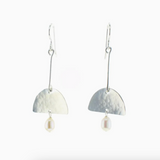 These artisan earrings are made with hand-forged sheet and are accentuated with genuine pearl. 1.5" Length. Sterling silver or 14K gold filled.