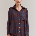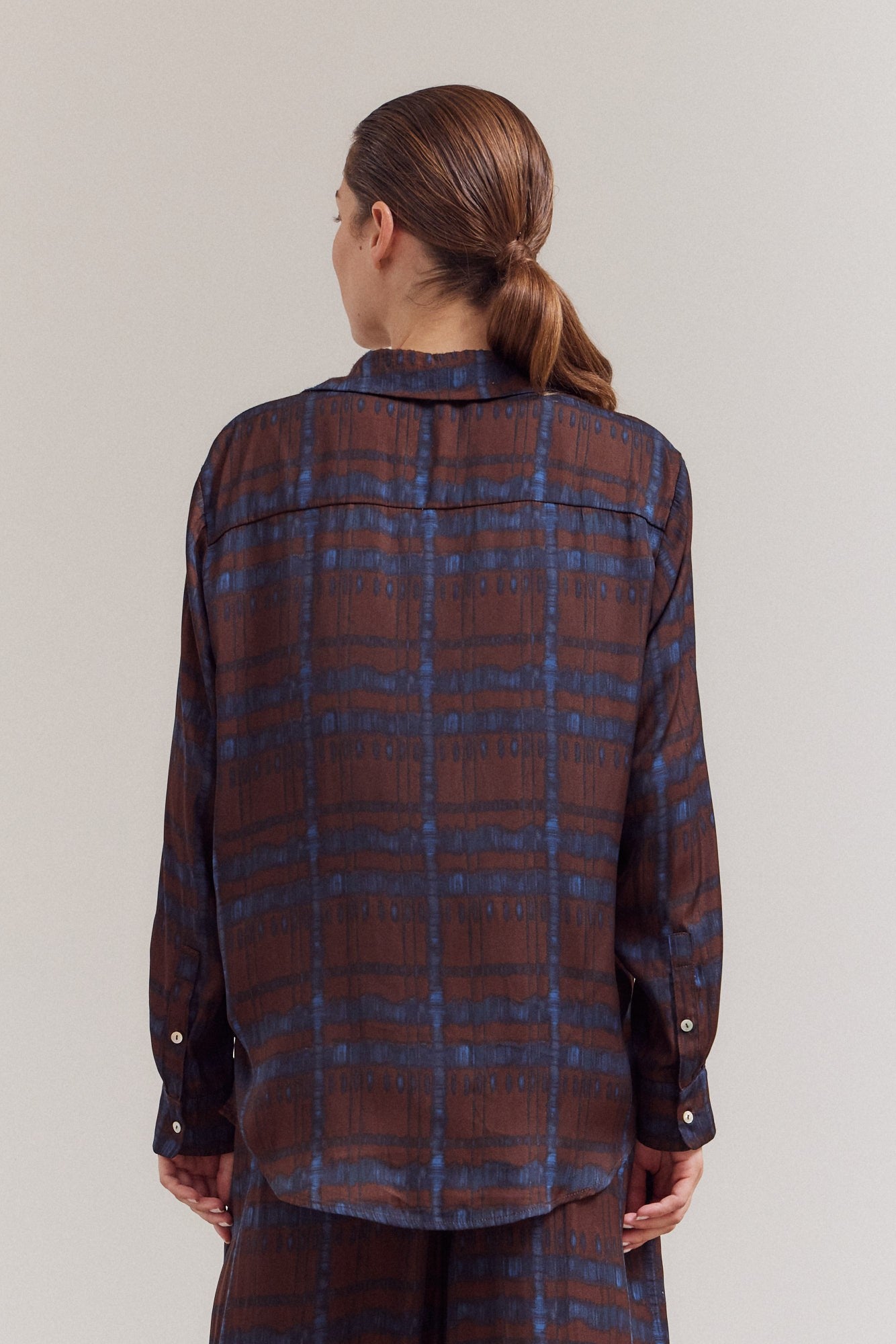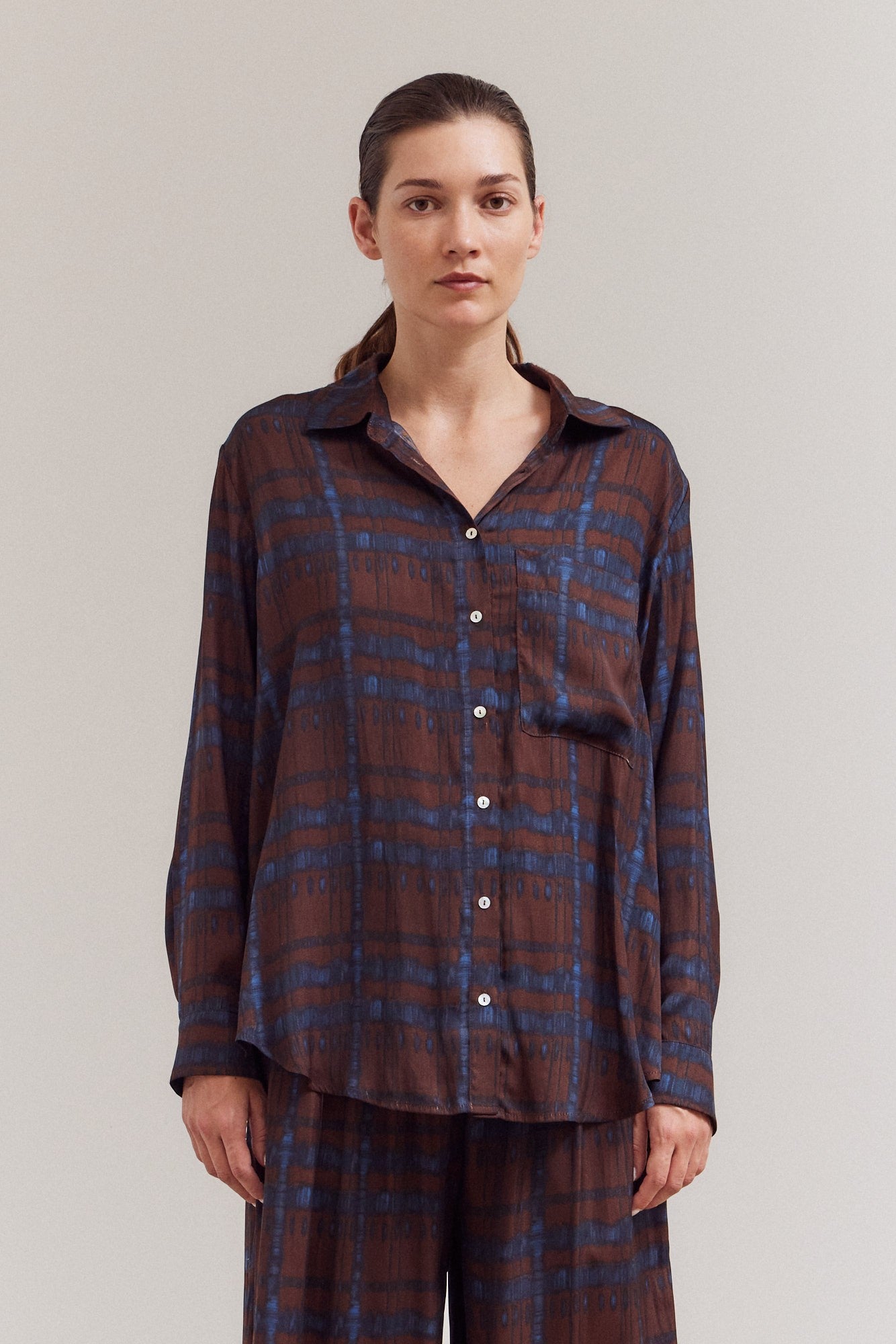 Sophisticated satin blouse featuring a striking plaid print. This versatile piece combines luxurious fabric with timeless pattern work, offering effortless elegance for both professional and casual settings. The smooth satin finish provides a refined drape and subtle sheen that elevates any wardrobe.