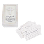 White-washed wooden prayer box features removable lid with framed pulp paper poem and wooden cross accent. Arrives with 12 recycled pulp paper prayer slips.