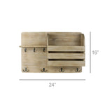 Corral mail, magazines, keys, and coats in style with this good-looking and totally functional wall mounted organizer. Made of wood with a subtle whitewash finish and a plethora of metal hooks. Hangs with 2 keyhole hangers.