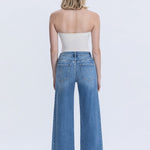 These wide-leg jeans feature a high-rise waist, distinctive side panel accents, and a step hem design. Crafted from comfort stretch denim in a medium dark wash, they offer an ankle-length fit that merges style with ease of movement.