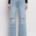 Crafted with a rigid, non-stretch denim fabric, these high-waisted flare jeans capture authentic 90s aesthetics with intentional distressing and a crisp light wash. The elevated rise provides classic proportions while the five-pocket construction delivers functional design.