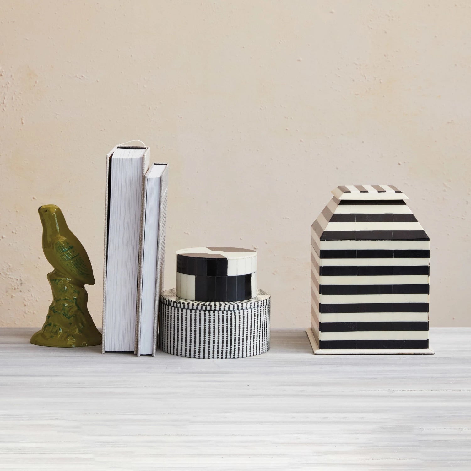 This resin and reclaimed wood box with stripes, black and white is a stylish and practical piece for any home. It consists of a round base and a lid that feature a resin and reclaimed wood construction and a striped pattern. The resin and reclaimed wood construction is durable and smooth, which makes this box last for a long time. The striped pattern creates a chic and contrasted effect that makes this box stand out. The black and white color adds a touch of elegance and simplicity to this box. It is perfect for storing and displaying jewelry, accessories, trinkets, or other small items in the bedroom, bathroom, or living room. It can also be used as a decorative accent on a shelf, table, or mantel. This box is easy to clean and maintain, and it will enhance any space with its beauty and style. It measures 4.5 inches in diameter and 2.25 inches in height, making it suitable for any space. This resin and reclaimed wood box with stripes, black and white is a must-have for anyone who loves style and functionality.