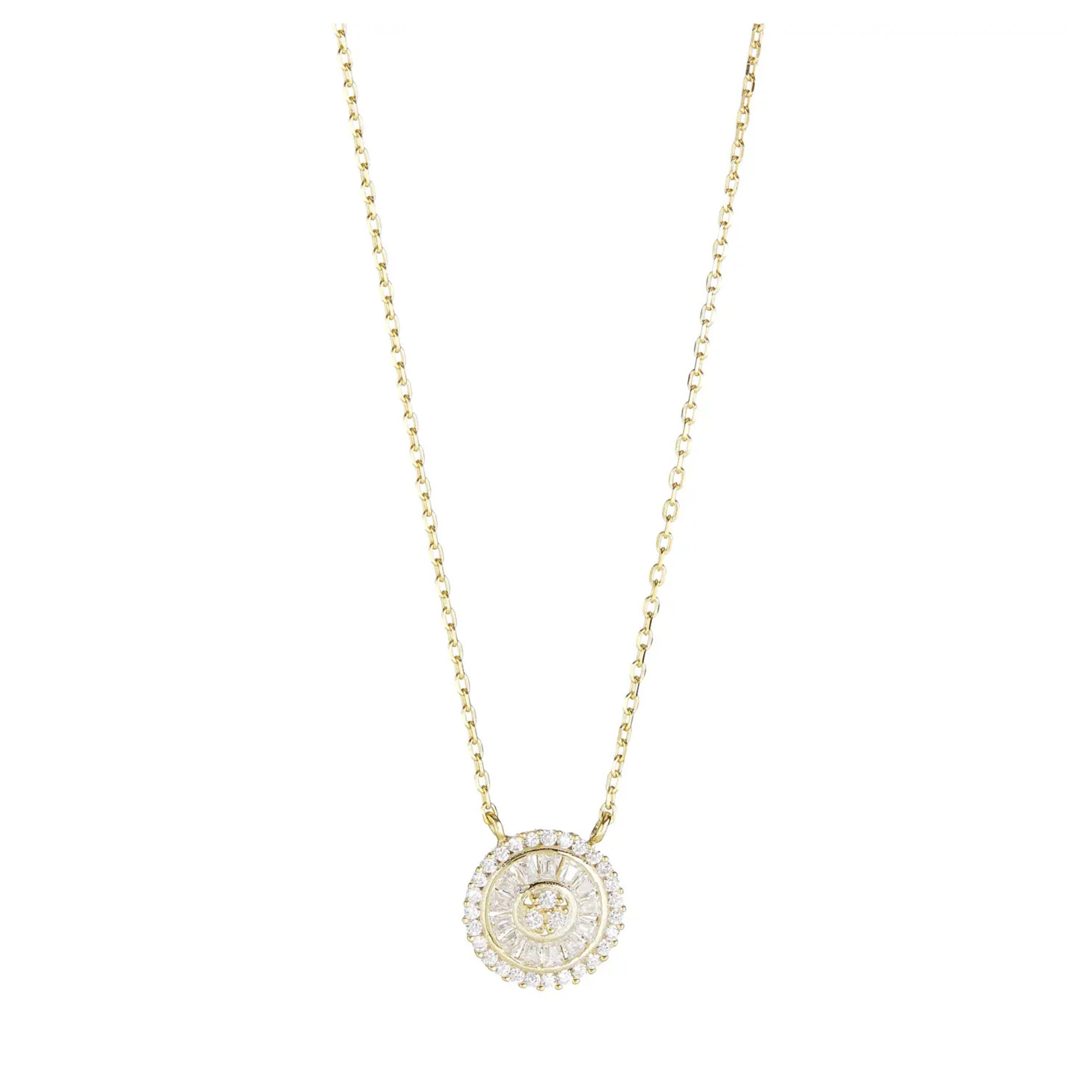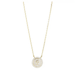 Discover the epitome of modern elegance with our Round Disc Baguette CZ Necklace. This stunning piece features a sleek round disc pendant, intricately set with dazzling baguette cubic zirconia stones that catch the light with every angle. The geometric arrangement of the CZ stones creates a sophisticated and contemporary look, perfect for adding a touch of glamour to any outfit.