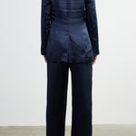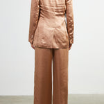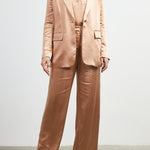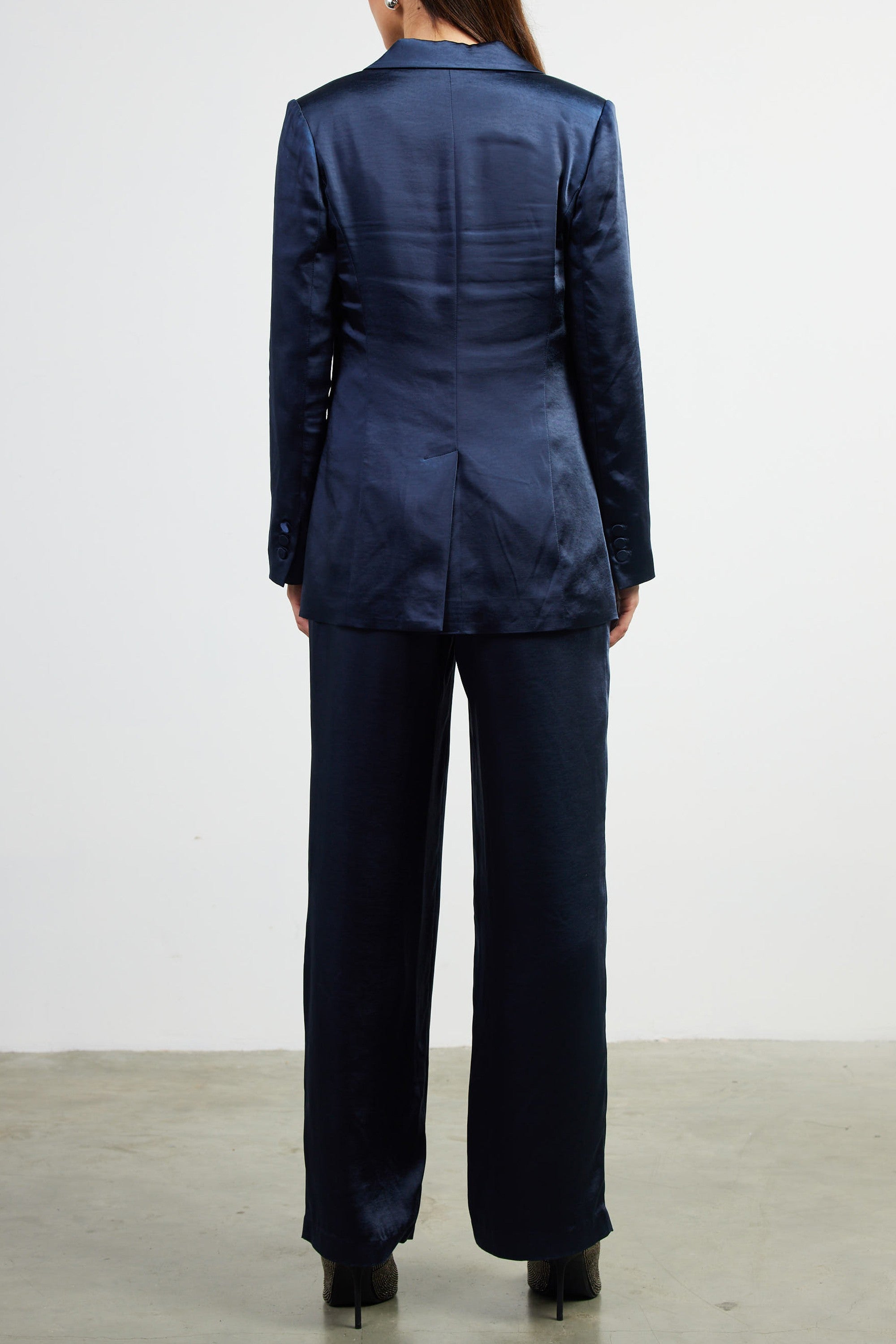 This long-sleeved satin blazer features a sophisticated single-button closure for a polished, elegant look.