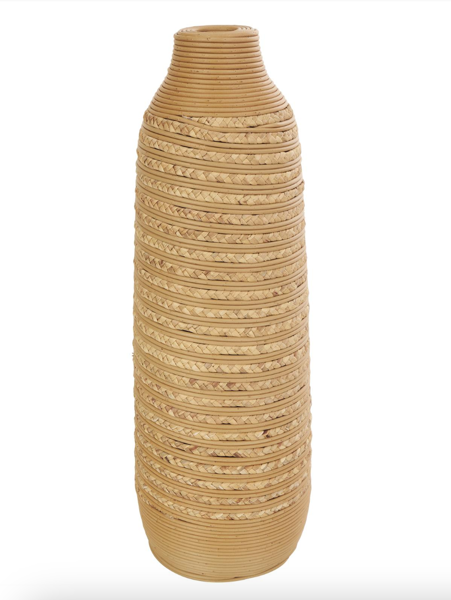 Dried water hyacinth and seagrass twined ropes wrap this decorativetall vase with narrow opening and deep setting