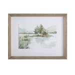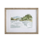Inspired by serene lake views, these watercolor-style sketches display tranquil shades of smokey blues, olive greens, and mustard yellows. Each landscape is accented by a white background and an gray washed pine frame under glass. Artwork by Anne Tavoletti.