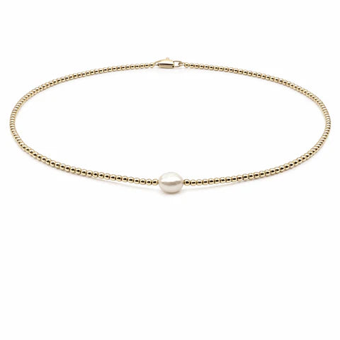 Discover timeless elegance with our 14k gold-filled 2mm beaded necklace featuring a unique single Baroque Pearl. This 16-inch piece is ideal for layering and designed to withstand water. Finished with a secure lobster clasp, it offers relaxed sophistication for any occasion.