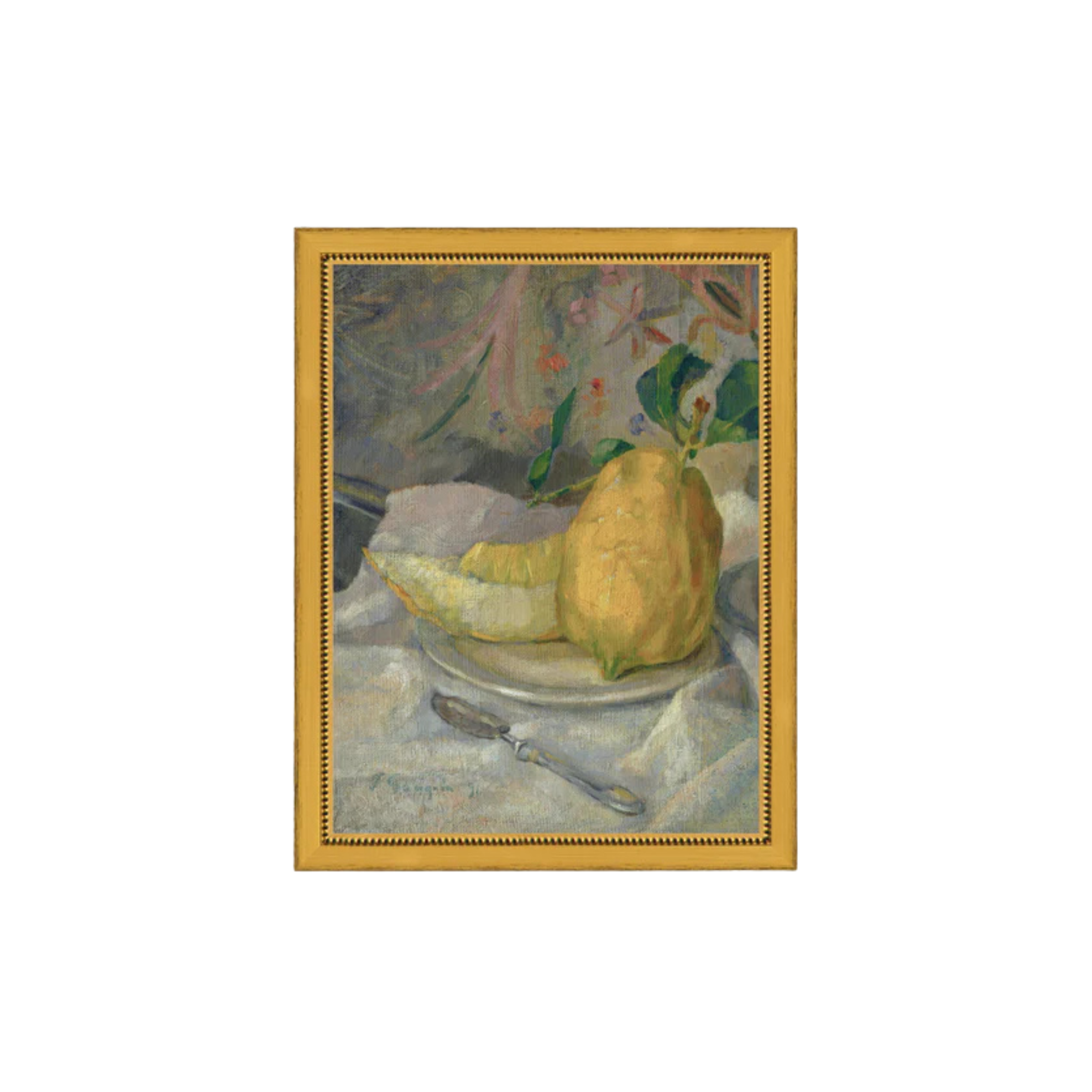 Discover this exquisite still life composition featuring vibrant melons and lemons, inspired by Paul Gauguin's distinctive artistic vision. This 7x9 piece captures the essence of late 19th-century Post-Impressionist style, showcasing rich color palettes and bold brushwork characteristic of the period. Perfect for art enthusiasts and collectors seeking an authentic representation of Gauguin's celebrated work. A timeless addition to any gallery or home space.