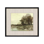 Landscapes in muted shades of green and brown feature premium matting. Framed in an aged black painted wood with washed antique gold beaded lip.