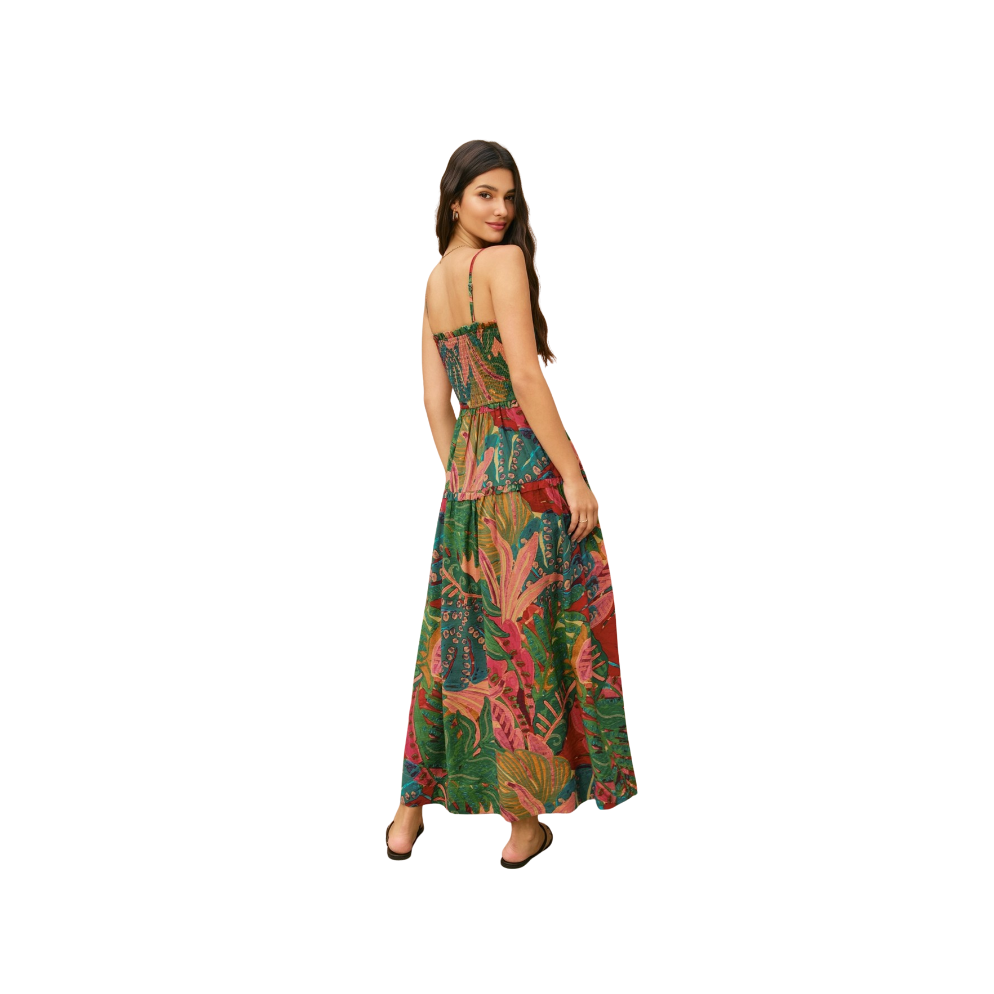 Featuring a gathered sweetheart neckline and delicate ruffled trim with intentionally raw edges, this piece showcases a smocked front bodice with strategic cutout detailing beneath the bust. The design includes a front side slit for movement, supported by adjustable spaghetti straps with ring and slider closures. The bodice is partially lined for structure and comfort, while the silhouette remains pocket-free for a streamlined aesthetic.