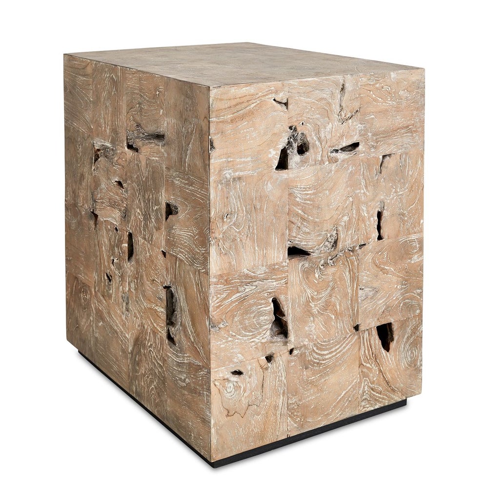 Squares of natural wire brushed teak are beautifully combined to create the Teak Tac Toe End Table. Finished with multistep drift wood and white ceruse featuring a recessed black wood base giving the table a floating appearance. Each piece will vary. Natural fissures and variations in grain are expected and add to the intrinsic value and uniqueness of each table.