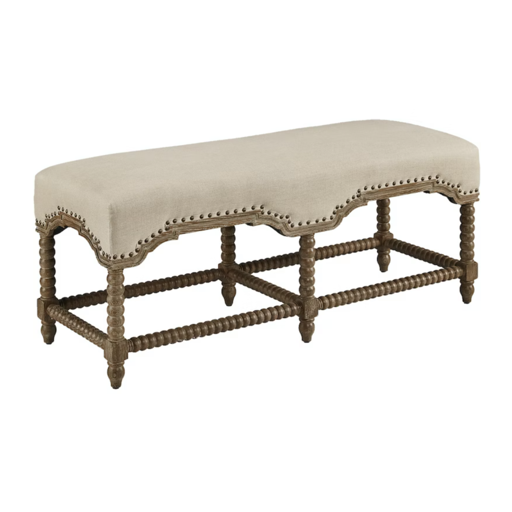 Spindle legs and an upholstered bench seat with nailhead detailing.