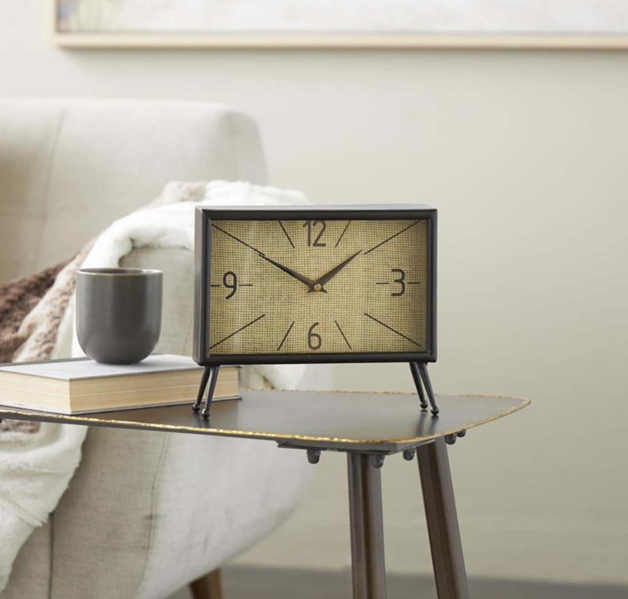 Rectangular metal clock that features a matte finish that adds a sleek touch, while the tea-stained clock face introduces a warm, vintage hue. A standout feature of this timepiece is its rectangular shape which deviates from traditional round clocks, making it an eye-catching addition to any room.