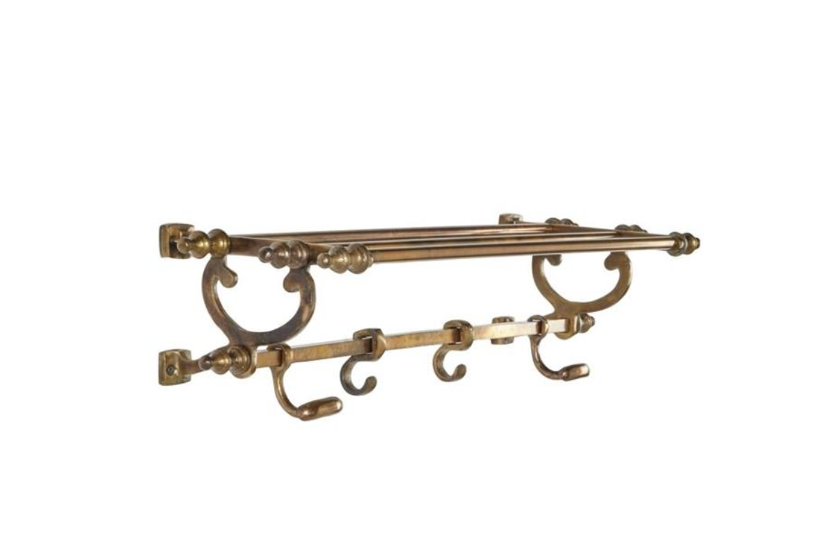 Brass wall rack with brass hooks. Solid aluminum and brass construction. Textured and decoratively-worn metallic gold antique finish. Features one floating wall rack and 7 metal wall hooks. Easy to hang with screws in the allotted holes and removable finials.