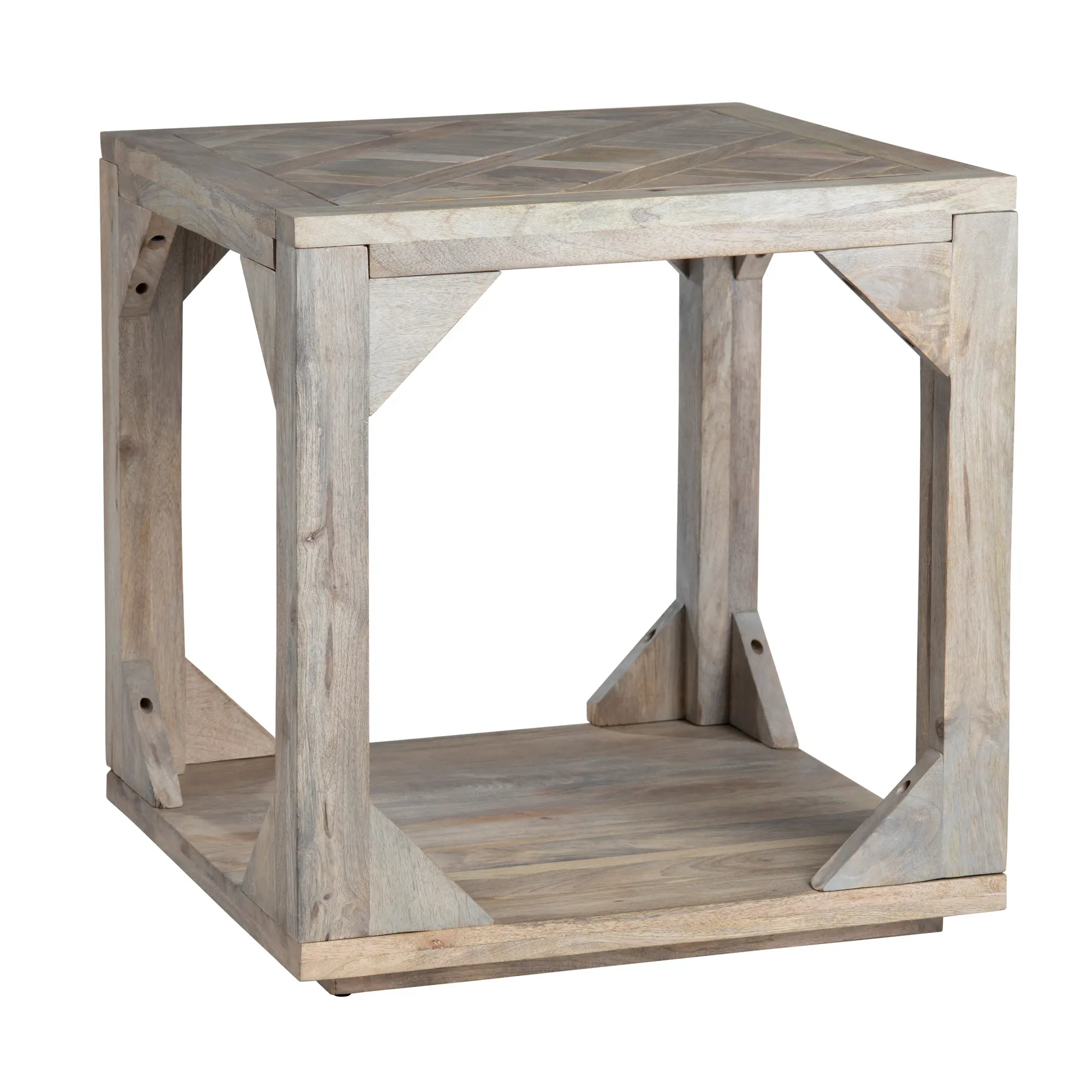 The Willow Brook Square End Table has a cube shape that makes it the perfect piece next to your chair. The top features a lattice design, and a lower shelf provides extra space for storage. Made of mango wood, this traditional style table has a light-brown finish that will complement your home décor.
