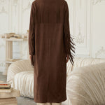Our Winslet fringe coat, showcased in a rich chocolate brown, provides an elegant outer layer that enhances the sophistication of any ensemble.
